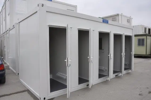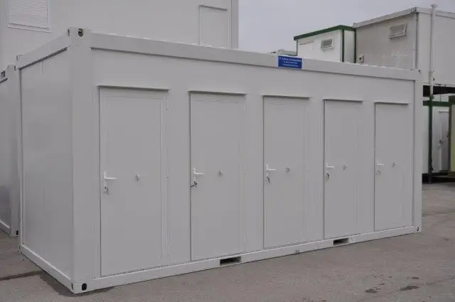 Bâtiment de 20′ x 8′ avec cinq espaces toilettes mixtes séparés.